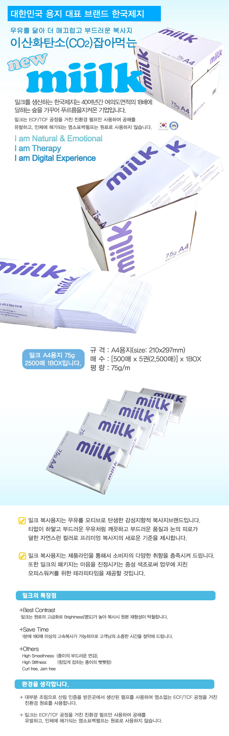 한국제지 복사용지, A4 밀크 75g [화이트/1박스-2500매]