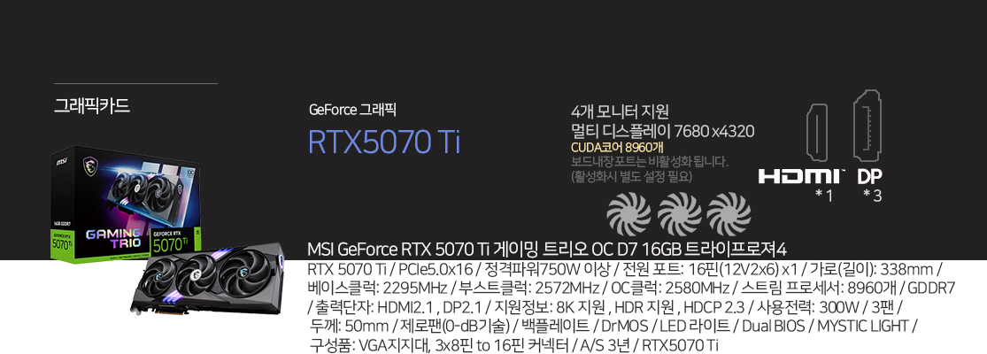 AMD 라이젠7 9800X3D / (32GB) 삼성전자 DDR5 (16x2) / MSI MAG B650 토마호크 WIFI / 삼성전자 PM9A1 1TB / CD롬 없음 / darkFlash DLX21 RGB MESH / PALIT RTX 5070 Ti 16GB / 8채널 사운드 / 2.5Gigabit LAN / 3RSYS RC1900 ARGB 쌍철봉 / 윈도우 별매 / 마이크로닉스 900W / 사은품 마우스 패드