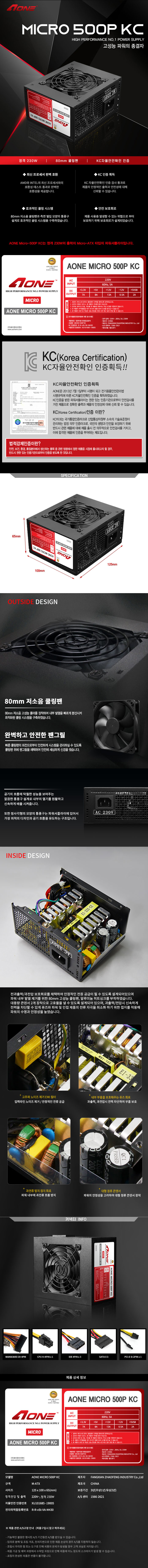 500W / Micro ATX / 80mm팬 / 저소음 / 20+4pin / SATA / PCI-E / EMI / 오토팬컨트롤 / 과전압,과전류방지회로