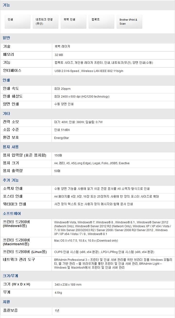 레이저 프린터 / 흑백(모노) 출력 / 20ppm / 2,400dpi / Mac 지원 / USB / 네트워크