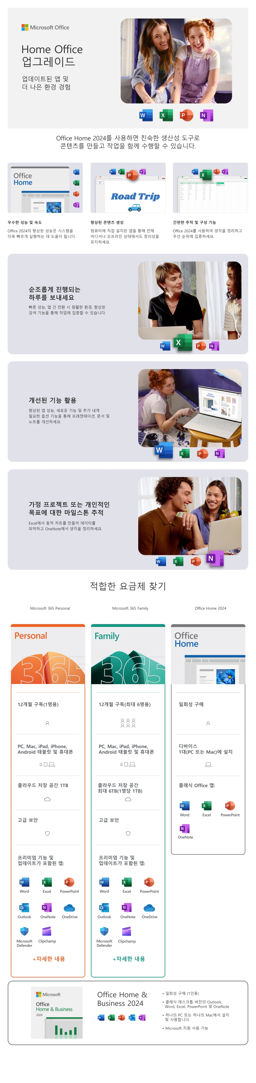 Office 2024 Home / 포함 프로그램 : Word, Excel, PowerPoint, OneNote / Windows 11, Windows 10 또는 macOS(최신 2개 버전)와 호환 / 소프트웨어 라이선스 허용 범위 : 개인이 비상업적 용도로 사용 가능 (관공서,기업,학교 등 기관이나 단체에서 사용불가)