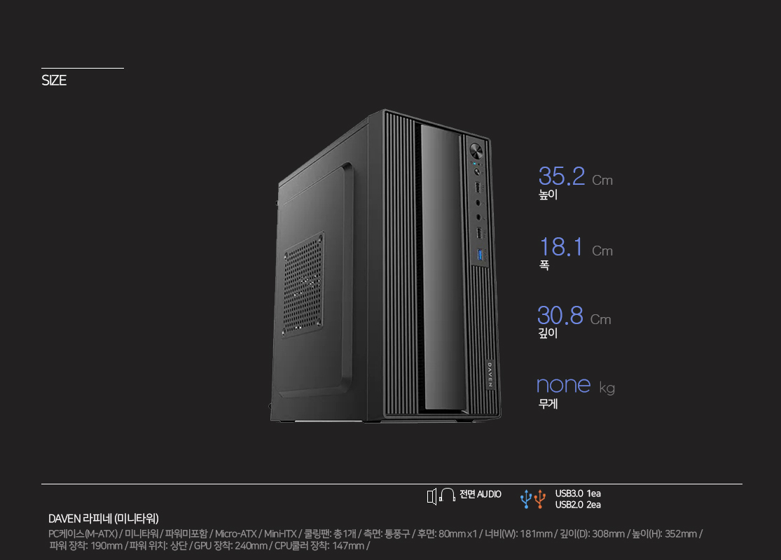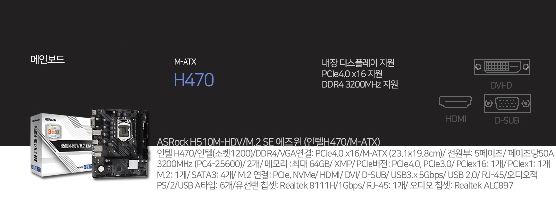 인텔 셀러론 G5905 / 에센코어 DDR4 8GB / ASRock H470 / 컬러풀 NVMe 256GB / CD롬 없음 / DAVEN 라피네 (미니타워) / 인텔 UHD 그래픽스 610 / 7.1채널 사운드 / Gigabit LAN / 컴이지 킹덤 SGD-120RGB / 윈도우 별매 / 일반 230W / 사은품 마우스 패드